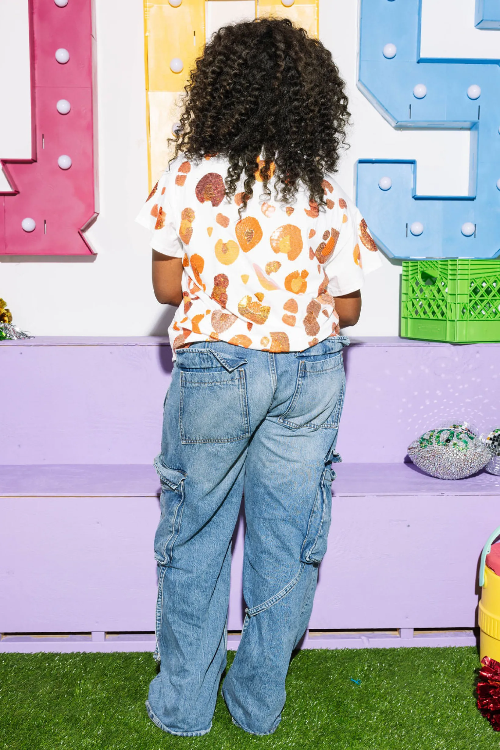 Unleash your wild side with this White & Orange Leopard Sequin & Seed Bead Tee. The perfect combination of sparkle and animal print, this tee will make you stand out in any crowd. Dress it up or down for a versatile and playful look. (Roar with style!)