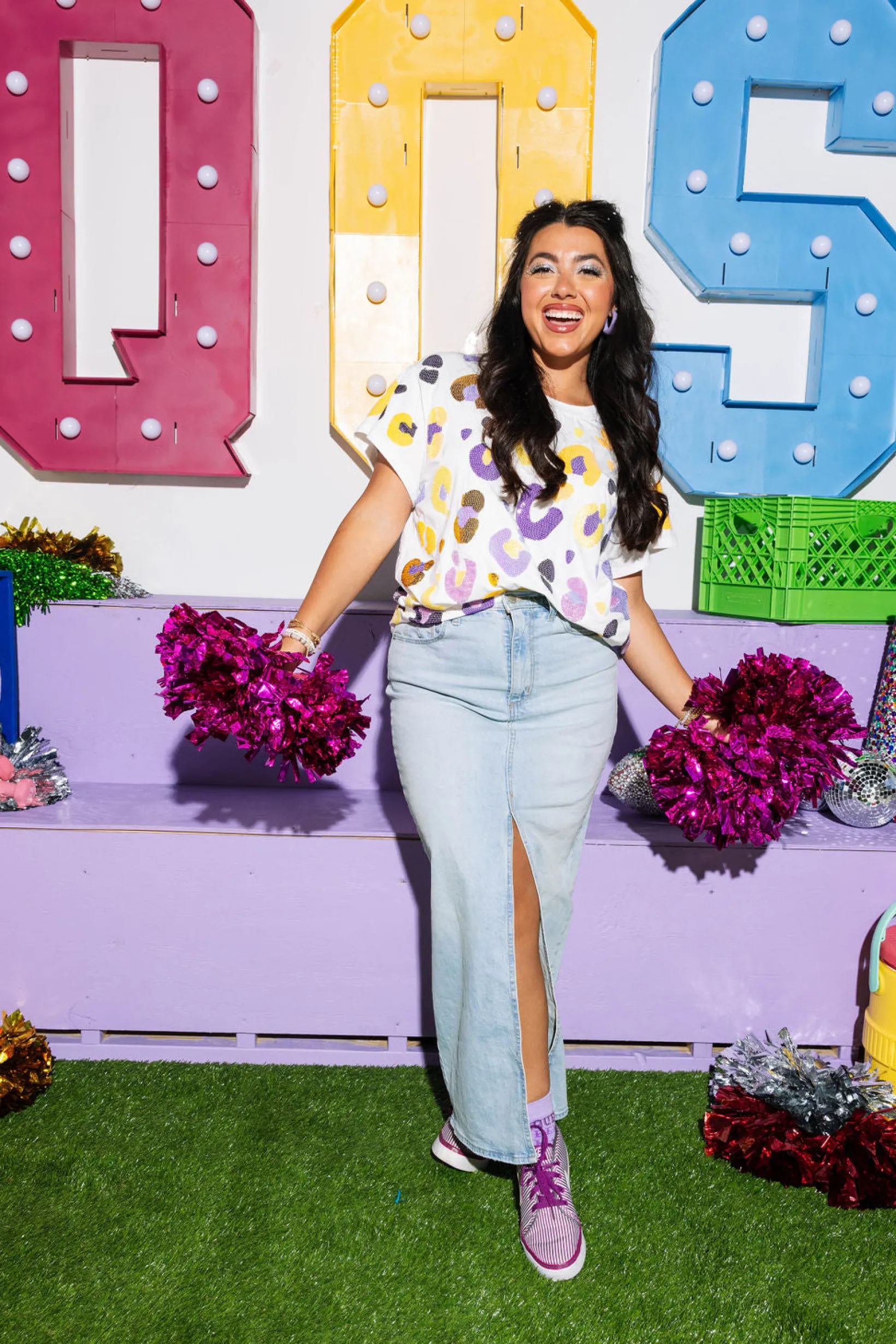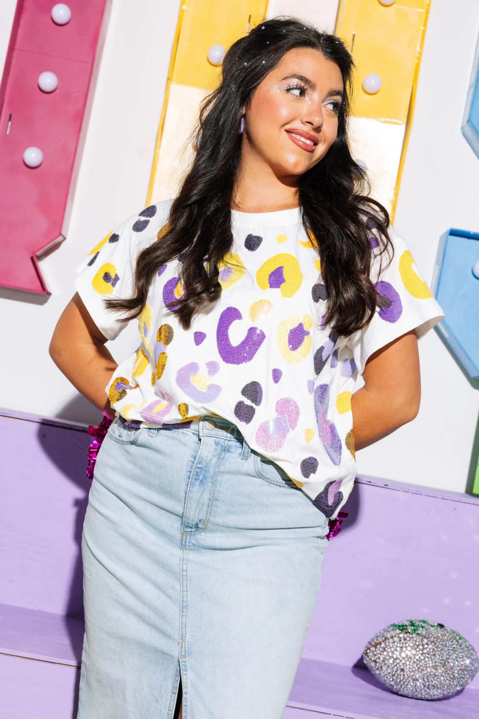 Roar and shine in this leopard print tee, adorned with white, purple, and yellow sequins and seed beads. A playful and stylish addition to your wardrobe. (Warning: may cause fierce and fabulous vibes.)