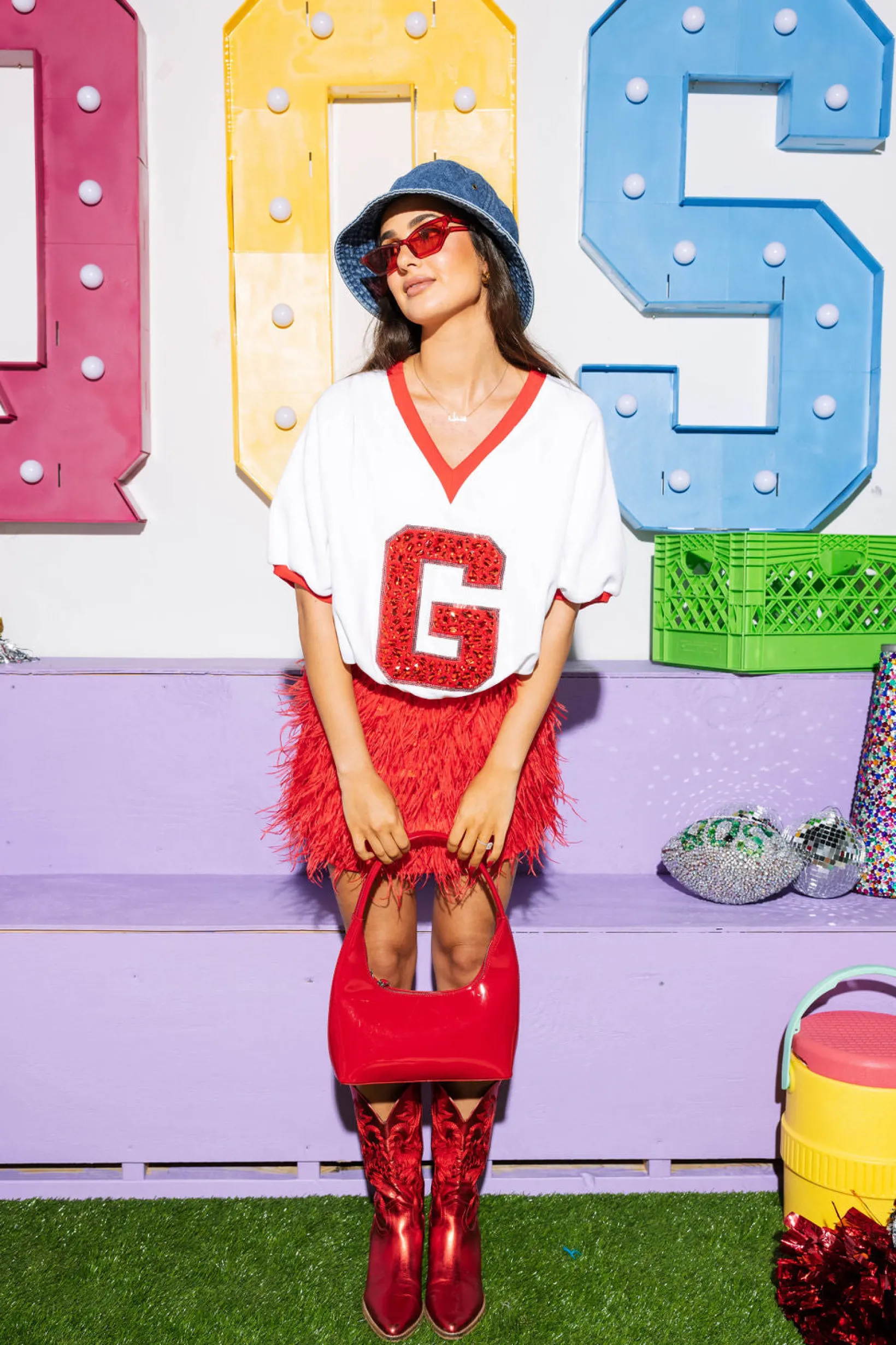 White & Red Jewel ‘G’ Bubble V Neck Top