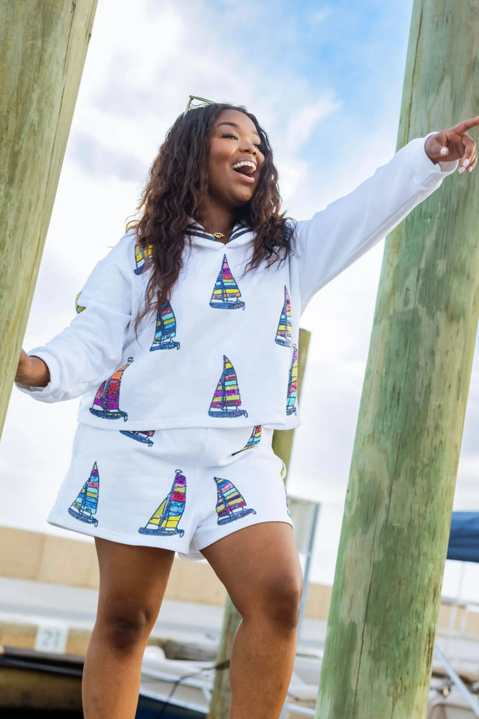 Meet our classic sweat shorts. Made from comfy, cozy cotton and bedazzled with a sequin sailboat design, you’ll never want to take them off. Pair them with the matching sweatshirt. Smooth sailing guaranteed!⛵︎🔆