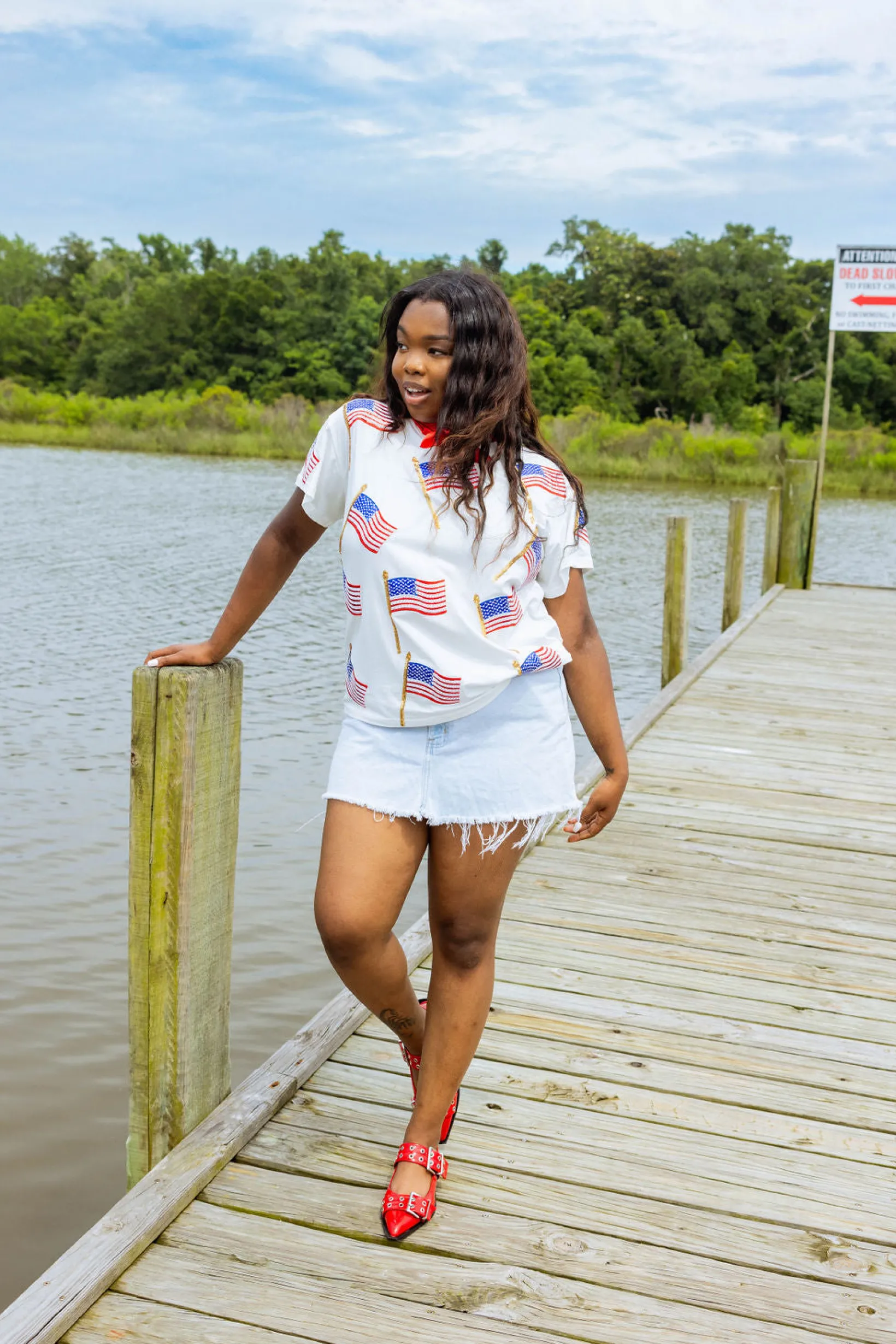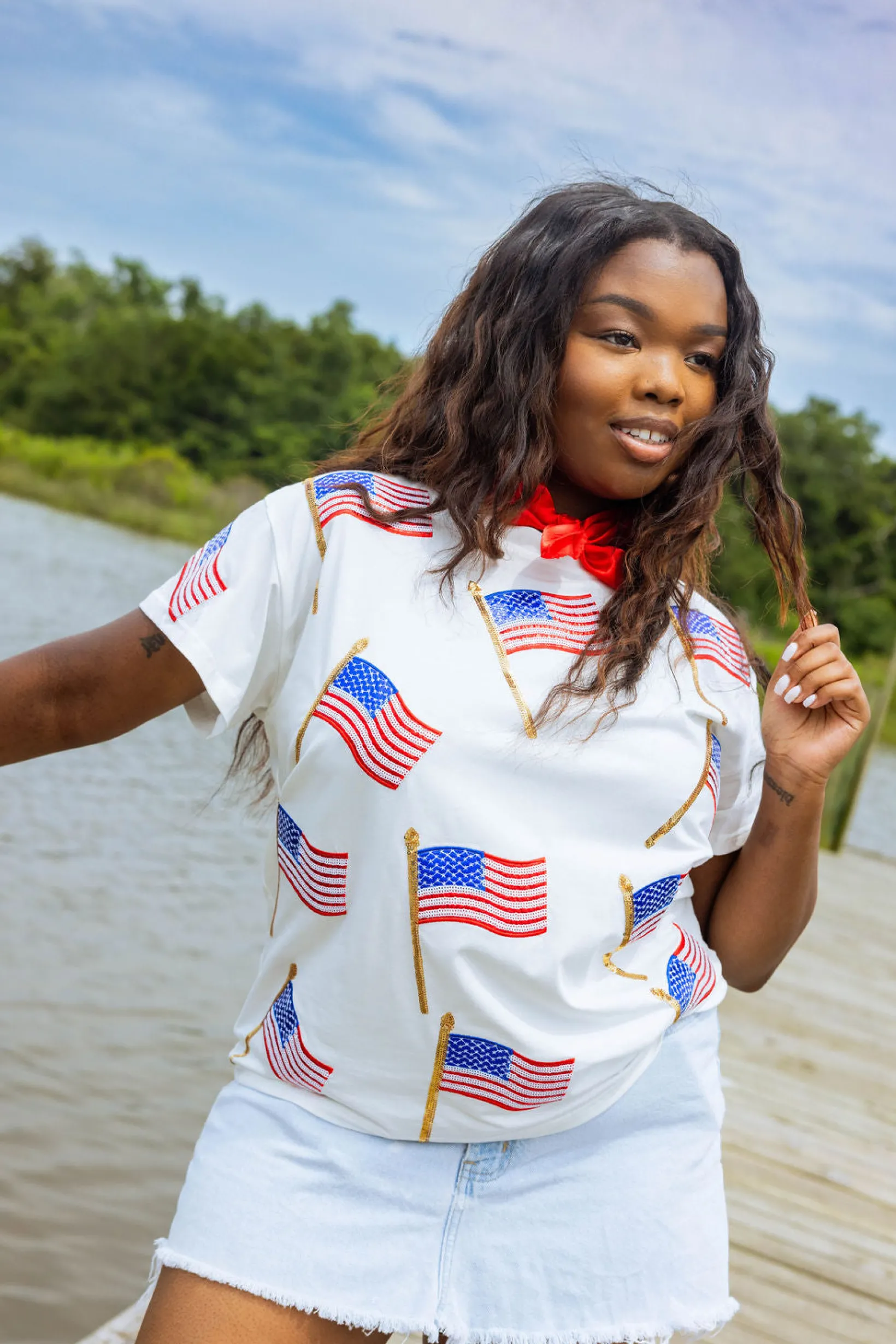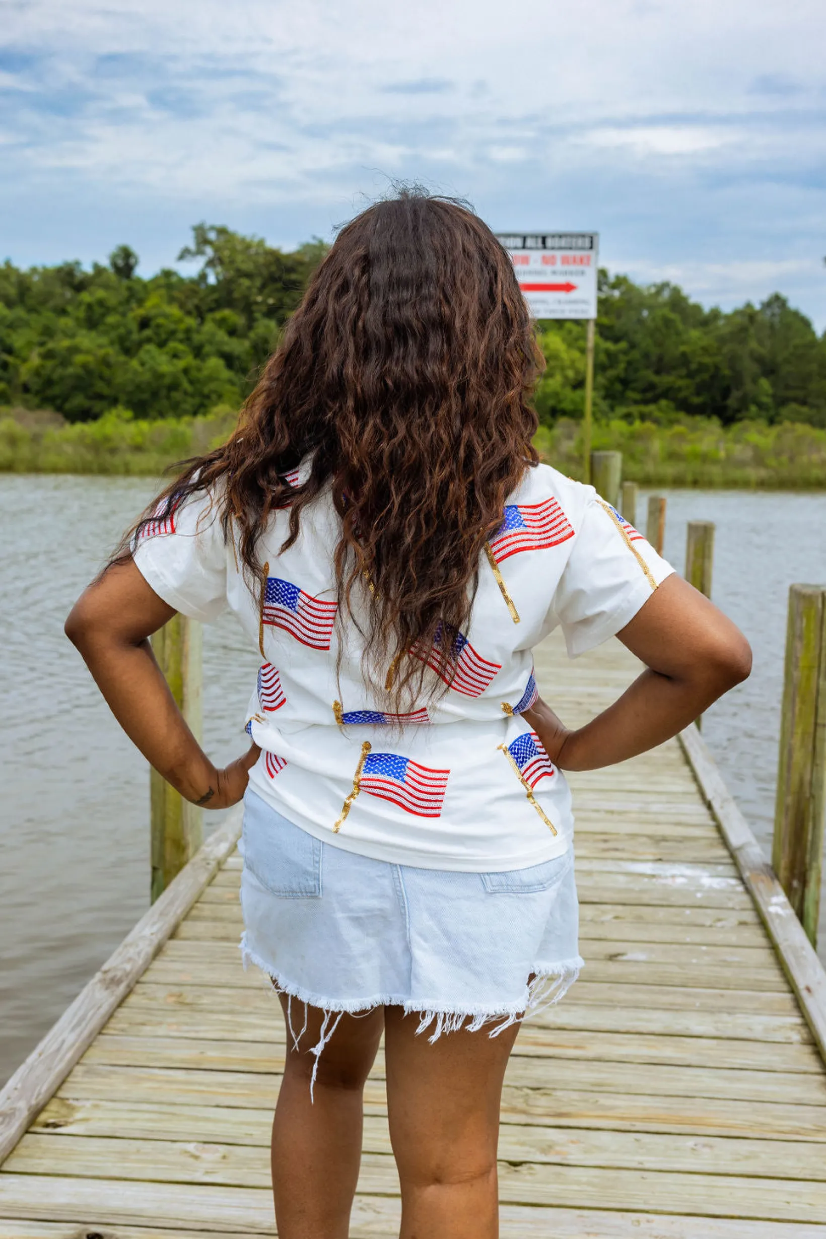 🇺🇸 Show off your patriotism with our White Scattered Metallic American Flag Tee! Perfect for 4th of July festivities, this shirt can be dressed up with shorts or dressed down over a swimsuit. Shine bright like the fireworks 🎆 with this fun and festive tee!