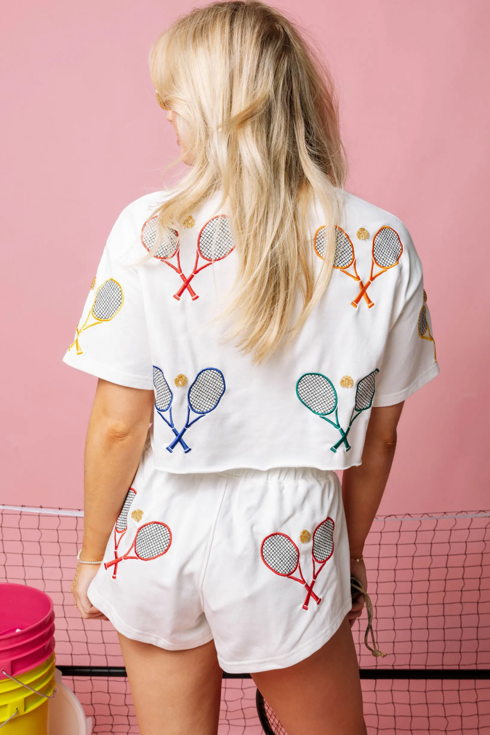 Serve up some sparkle with this top! Our raw hemmed top is cute and cropped, complete with sequined tennis rackets. Game, set, match – you’ll be the talk of the court!πΎπ