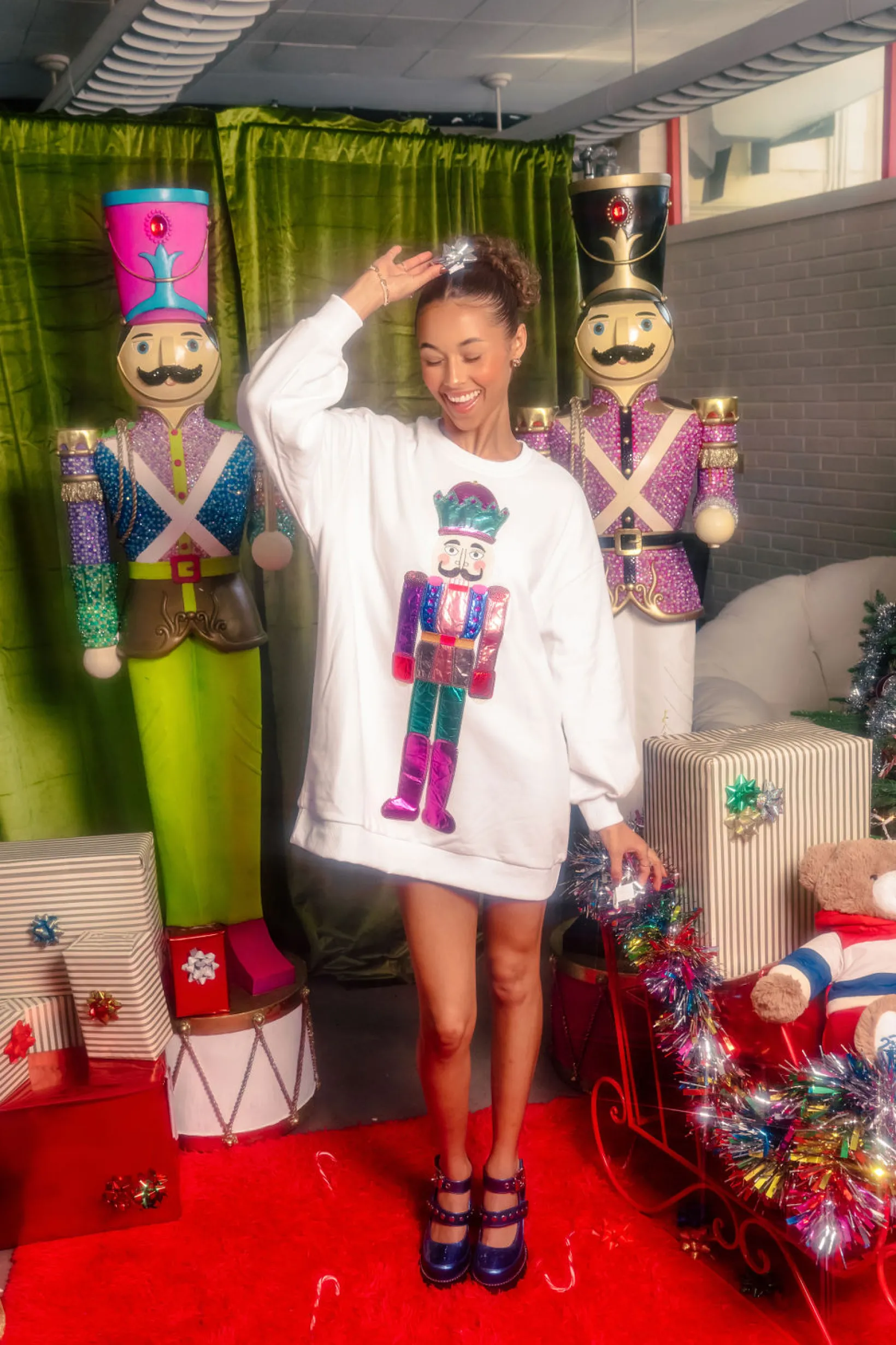 Stay warm and stylish this winter with our unique White Sweatshirt Dress featuring a multi-colored nutcracker design. Oversized and crafted from soft fabric, this dress is perfect for all your Christmas celebrations. A bold metallic design elevates this dress from everyday to special. Check out the kids version for the whole family to match!