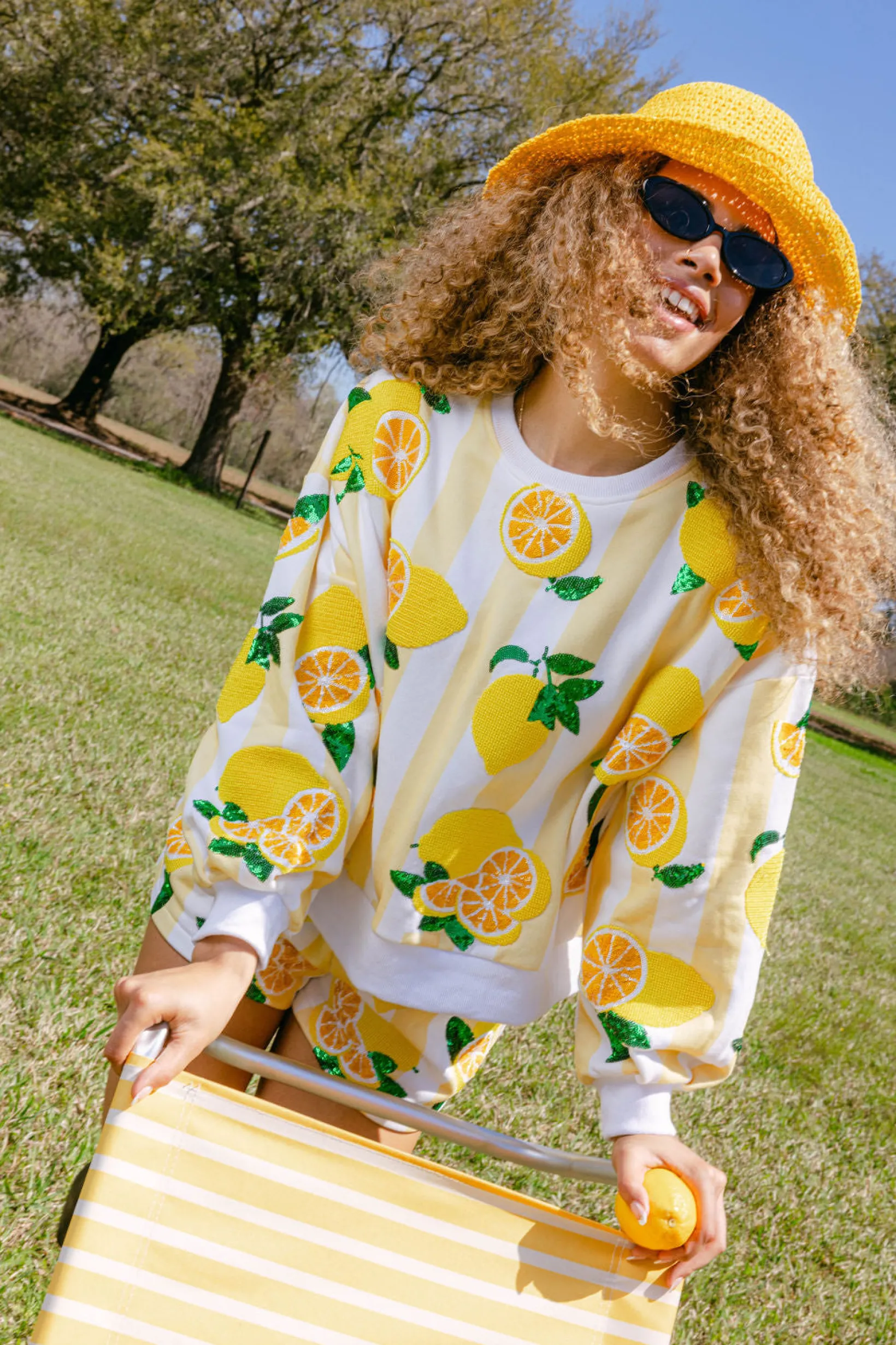 Keep it fresh and fruity with our Yellow & White Stripe Lemon Sweatshirt! The perfect blend of classic and boho, this top features a chic balloon sleeve and extra roomy fit for ultimate comfort. Spruce up your wardrobe and add a touch of citrus to your style.🍋🧺